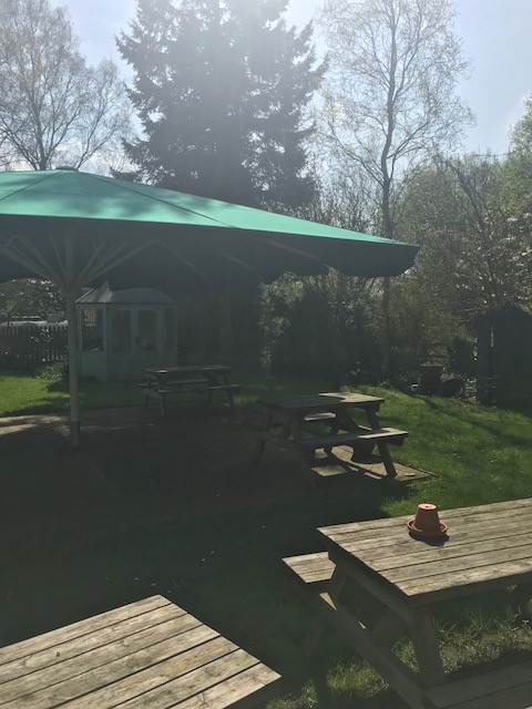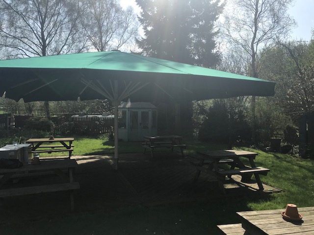 The May umbrella had had years of use, the cover was covered with leaf mould and the seams were in a very poor state and there were numerous holes in the canopy.